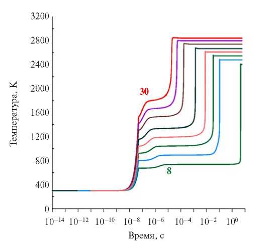В энергетическом же диапазоне процесс получения высокотемпературного рабочего тела при повышенном давлении, как отмечалось выше, имеет устойчивую «стадийную» структуру, что иллюстрирует представленное на рис. 6 семейство кривых эволюции температуры рабочего тела, активированного треугольным импульсом тока (50 нс) в качестве основного параметра активации. На логарифмической шкале времени эволюции температуры смеси можно выделить три участка с практически постоянной температурой: два участка с быстрым, близким к скачкообразному, ростом температуры и еще два, менее выраженных, и сравнительно плавного температурного перехода между соседними изотермами. Стадийность воспламенения рассмотрим на примере стехиометрической топливно-воздушной смеси, активированной треугольным импульсом тока (50 нс) с амплитудой 24 кА/м.