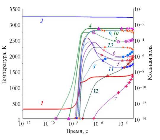 Рис. 8. Изменение мольных долей углеводородов в стехиометрической метано-воздушной смеси, активированной импульсом тока (50 нс, 20 кА/м): 1 – температура, 2 – концентрация CH4, 3 – CH3, 4 – CH2O, 5 – CHO, 6 – CH3O, 7 – C2H2, 8 – C2H4, 9 – CH3CHO, 10 – CH3OH, 11 – CH2OH, 12 – C3H6, 13 – C2H5OH.