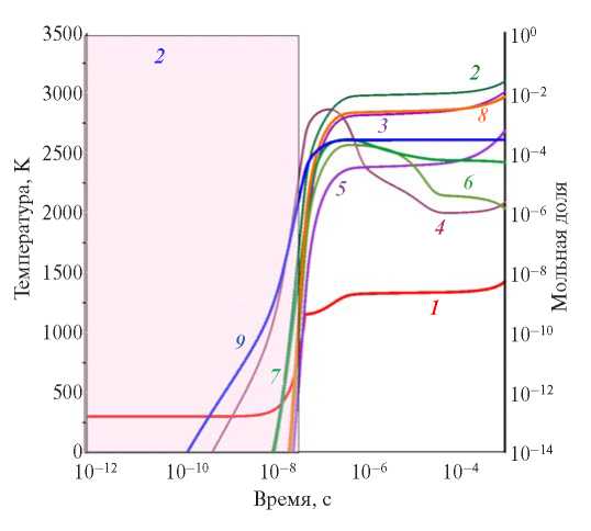 Рис. 9. Изменение мольных долей окислов и радикалов в стехиометрической метано-воздушной смеси, активированной импульсом тока (50 нс, 20 кА/м): 1 – температура, 2 – концентрация H2O, 3 – CO, 4 – OH, 5 – CO2, 6 – H2O2, 7 – HO2, 8 – H2, 9 – NO; закрашенный прямоугольник – интервал действия разряда.
