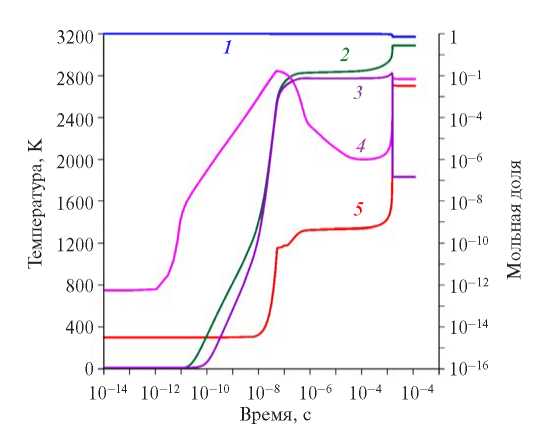 Рис. 10. Эволюция температуры и состава метано-воздушной смеси, активированной импульсом тока (50 нс, 20 кА/м) в групповом представлении: 1 – начальный состав и концентрация молекулярного водорода, 2 – концентрации окислов и радикалов, 3 – промежуточных углеводородов, 4 – ионов, электронов и атомов, 5 – температура.