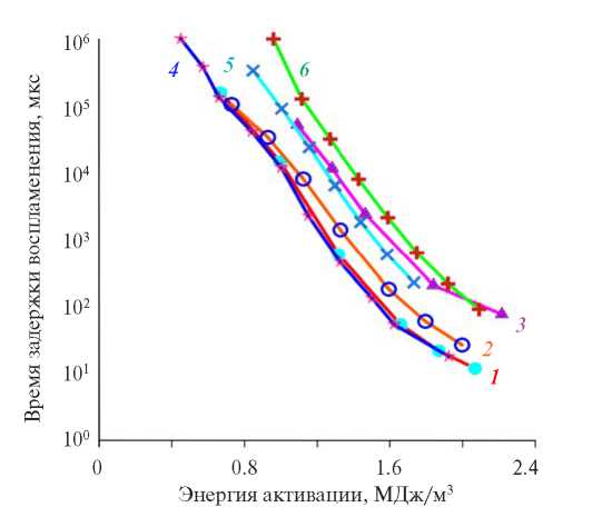 Рис. 12. Время задержки воспламенения при различных механизмах активации: 1 – активация импульсом тока длительностью 10 нс, 2 – 50 нс, 3 – 50 мкс, 4 – N-активация, 5 – термоактивация, 6 – термоактивация (обедненная смесь).