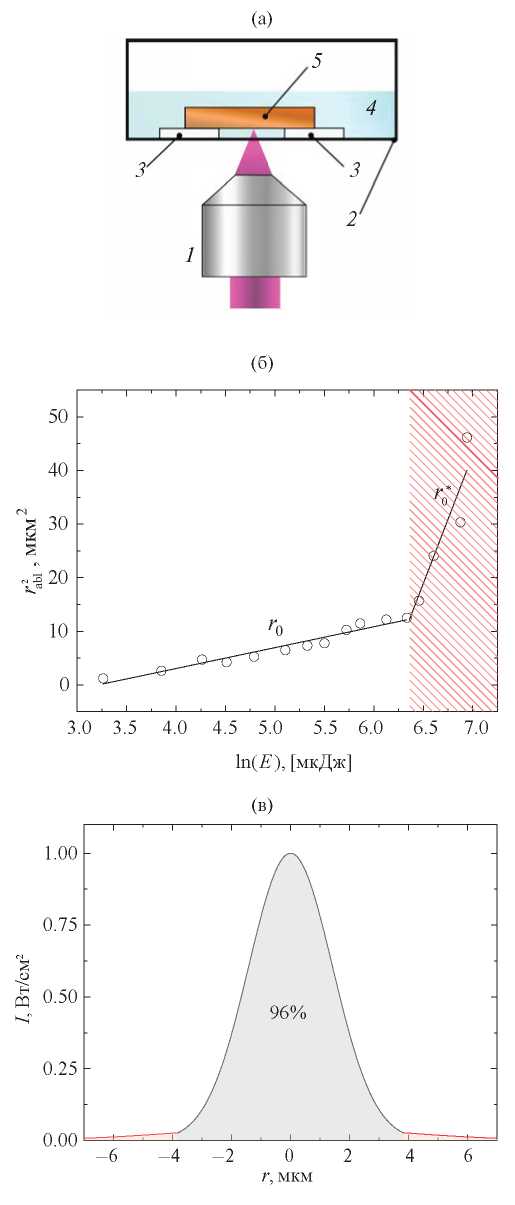 Рис. 2. Измерение размера лазерного пятна: (а) – мишенный узел: 1 – микрообъектив, 2 – чашка Петри со стеклянным дном, 3 – проставки, 4 – вода, 5 – мишень из Cu; (б) – зависимость квадрата размера кратера r 2abl от логарифма энергии ln(E): маркеры – экспериментальные данные, прямые – линейная аппроксимация; (в) – пространственное распределение интенсивности излучения.