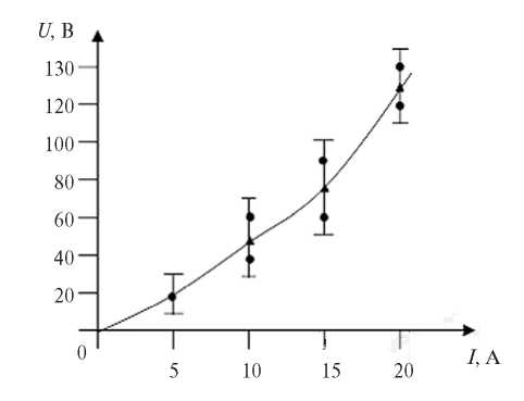 На рис. 2 приведена осредненная вольт-амперная характеристика (ВАХ) электрического разряда постоянного тока в электролитно-пузырьковой среде при атмосферном давлении, l1 = 5 мм и l2 = 35 мм. Для измерения напряжения использован вольтметр с классом точности 1.5%, а для измерения силы тока – амперметр с классом точности 1.5%. Межэлектродное расстояние определялось с помощью штангенциркуля с точностью 0.05 мм. В качестве электролита взят 1%-ный раствор сульфата аммония. Как видно из рис. 2, ВАХ электрического разряда имеет почти линейно возрастающий характер.