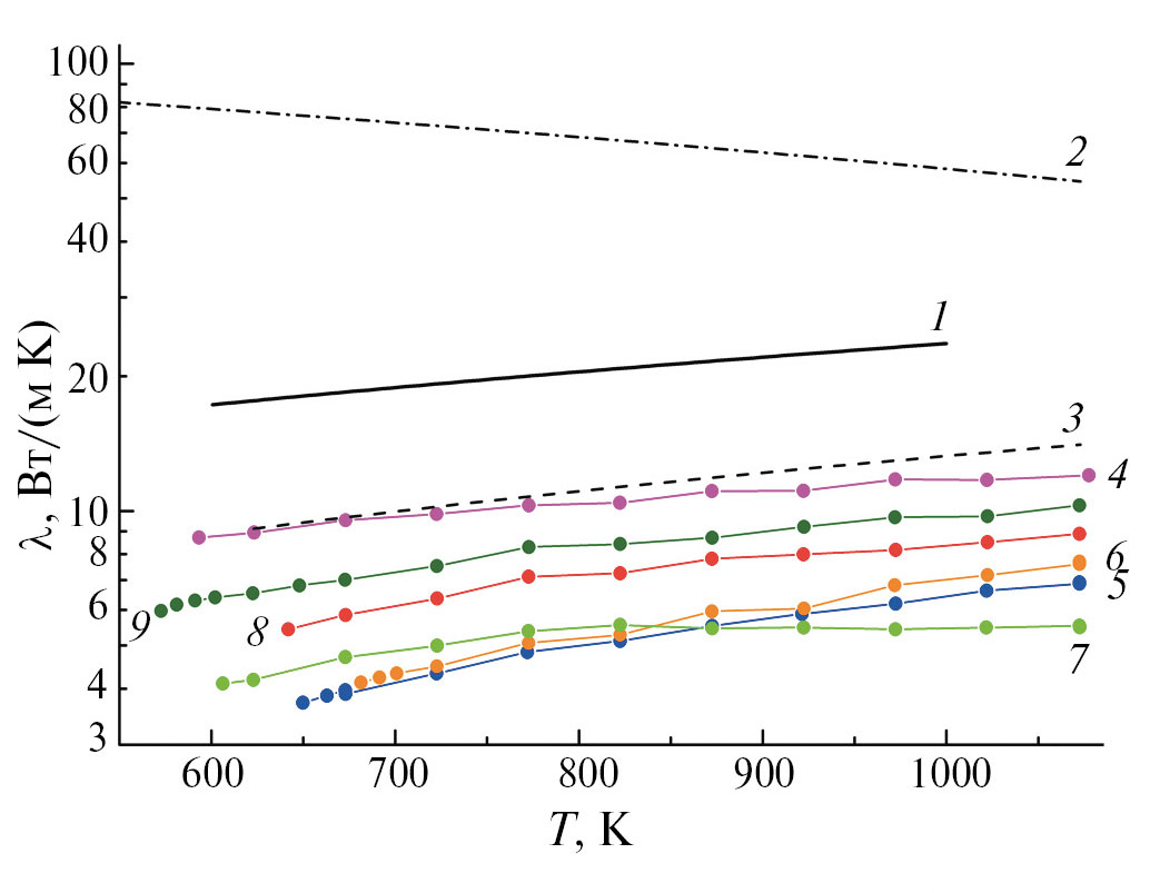 Рис. 1. Теплопроводность жидких сплавов Na–Pb: 1 – данные для Pb [20], 2 – Na [21], 3 – Na20Pb80 [18], 4 – Na90Pb10, 5 – Na79Pb21, 6 – Na69Pb31, 7 – Na59Pb41, 8 – Na50Pb50, 9 – Na37Pb63; ось ординат представлена в логарифмическом масштабе.
