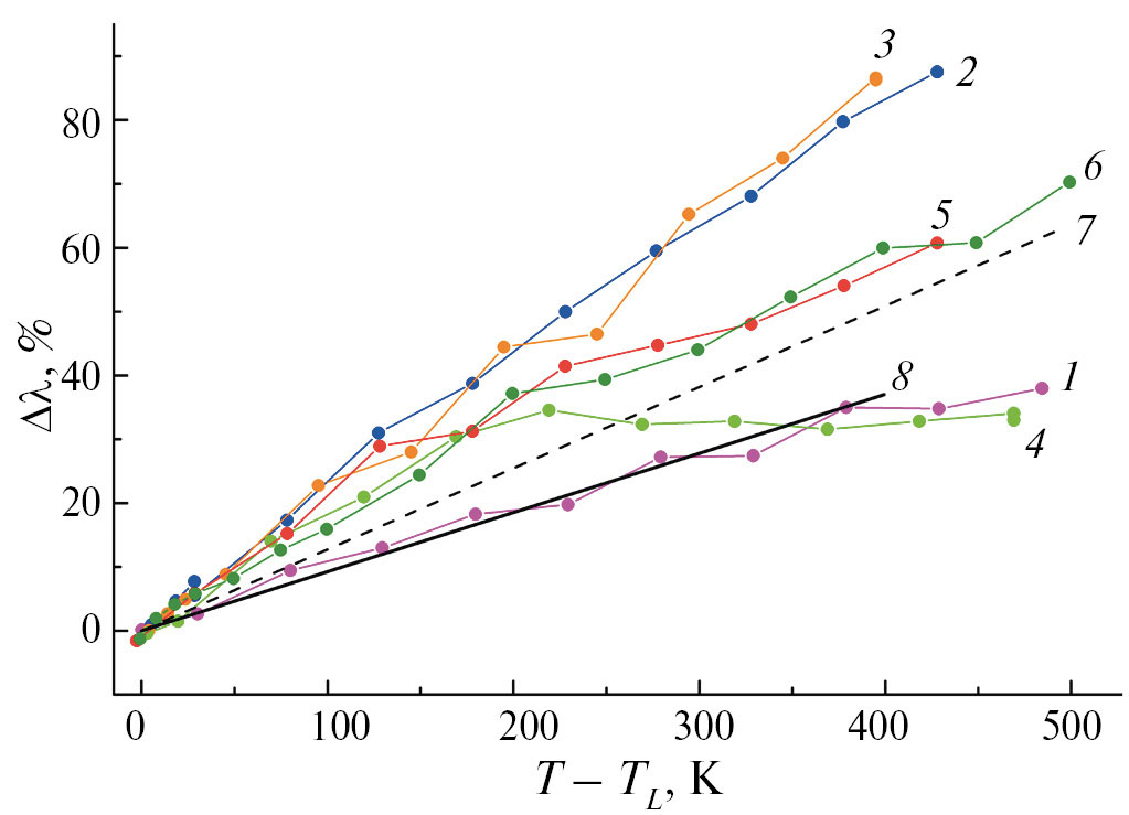 На рис. 2 представлены изменения теплопроводности ∆λ сплавов относительно значения λ при температуре ликвидуса TL. Видно, что наибольший относительный рост λ с температурой наблюдался у составов Na79Pb21 и Na69Pb31. Величина λ для этих расплавов увеличилась более чем на 80% при нагреве на 400 К выше TL, тогда как у других составов ∆λ не превышает 60%. Это хорошо согласуется с результатами исследования температурного коэффициента удельного электросопротивления в [7–9]. Так, в этих работах было выявлено, что величина на концентрационной зависимости имеет минимум вблизи XPb = 20 ат. % и принимает отрицательные значения для расплавов, содержащих ~ 15–30 ат.% Pb. Рост кривых λ(T) с увеличением температуры в совокупности с отрицательными значениями может свидетельствовать о диссоциации упорядоченных структур в расплавах Na–Pb с высвобождением все большего числа свободных электронов. Вероятно, более резкий рост λ для Na79Pb21 и Na69Pb31 указывает на максимальную относительную долю ионных комплексов типа M4Pb, разрушение которых более активно восстанавливает металлическое поведение данных расплавов по сравнению с другими.