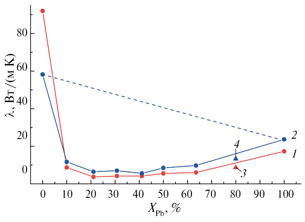 Рис. 3. Концентрационные зависимости теплопроводности жидких сплавов Na–Pb: 1 – при TL, 2 – при 1000 К, 3 – Na20Pb80 при TL [18], 4 – Na20Pb80 при 1000 К [18]; пунктирная линия – расчет по правилу аддитивности.