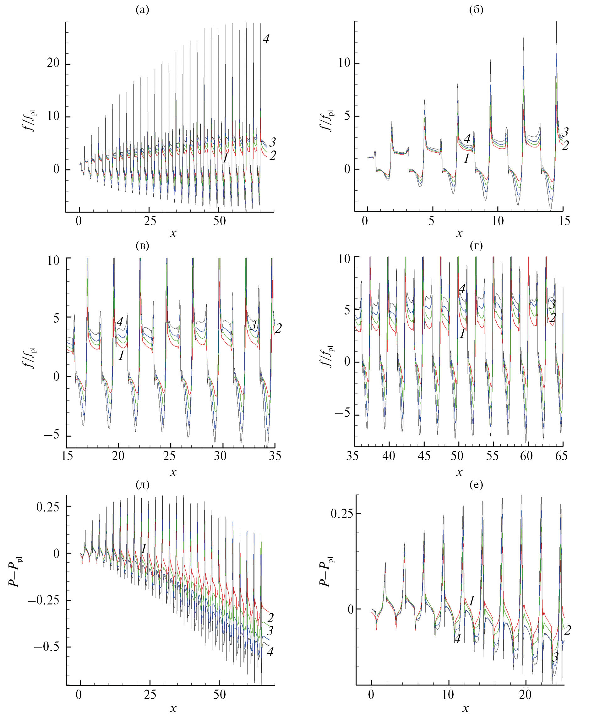 Рис. 4. Влияние Re на продольные распределения относительного трения f / fpl (а)–(г) и перепада статического давления P–Ppl (д), (е) в сечении z = –3.245, представленные на различных участках канала: 1 – Re = 1000, 2 – 1500, 3 – 2000, 4 – 2500.