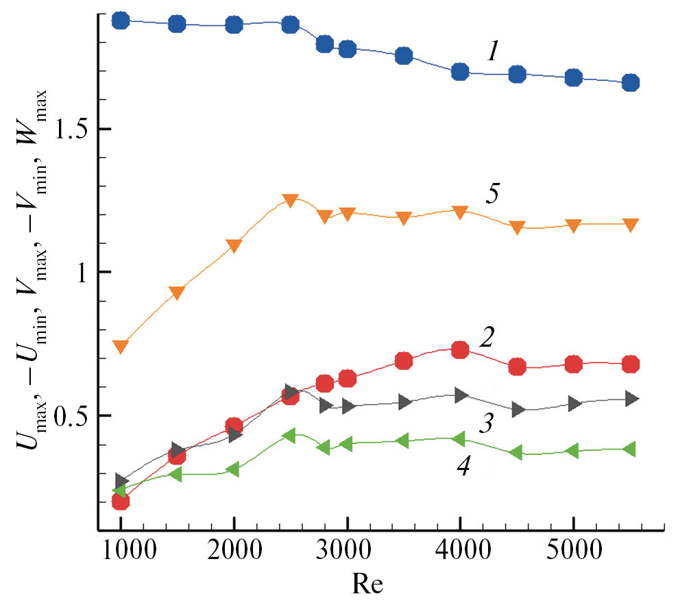 Рис. 7. Влияние числа Рейнольдса на экстремальные величины продольной, вертикальной и трансверсальной составляющих скорости: 1 – Umax, 2 – (– Umin), 3 – Vmax, 4 – ( –Vmin), 5 – Wmax.
