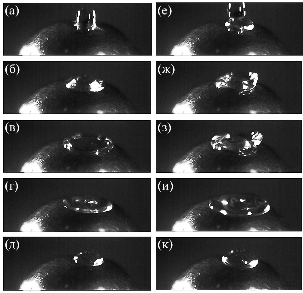 Рис. 2. Иллюстрация процесса последовательного соударения двух капель с поверхностью модели с полусферическим торцем (dd = 3.0 мм, Vd = 1.3 м/с, We = 70, Re = 4300, Td = 25°С, TW = 27°С): (а) – τ1 = 0, (б) – 1 мс, (в) – 3.5, (г) – 7, (д) – 31.5, (е) – τ2 = 0, (ж) – 2, (з) – 3, (и) – 9.5, (к) – 67.5.