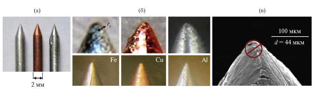 1.1. Приготовление электродов. Использовались три типа электродов, изготовленные из проволок углеродистой стали (Fe), меди (Cu) и алюминия (Al). Форма и размеры показаны на рис. 1. Конусы заострений изготавливались на станке, затем дорабатывались вручную под микроскопом и шлифовались наждачной бумагой с размером зерен 10–25 мкм. Средний радиус закруглений кончиков составлял r0 = 22 мкм. Угол заострения равен 30°.