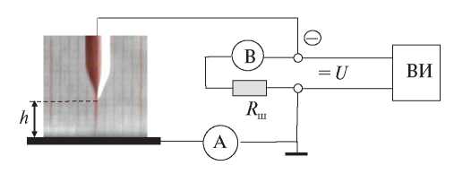 1.2. Измерение ВАХ и пульсаций тока. Информацию о распределении плотностей зарядов и механизма зажигания КР можно получить из вольт-амперных характеристик. Измерения ВАХ производились в системе электродов отрицательная игла–плоскость при атмосферном давлении. Схема установки представлена на рис. 2. Ток измерялся мультиметром MAS 830L. В режиме измерения темнового тока применялись мультиметр DT9208A и пикоамперметр Keithley 6487. Обратим внимание, что в схеме не используется балластное сопротивление, которое ограничивает ток при появлении пробоя. Сопротивление шунта Rш составляло 224 МОм, сопротивление катушки вольтметра 2.16 кОм. Тарирование показаний стрелочного вольтметра осуществлялось с помощью электростатического киловольтметра С 75.