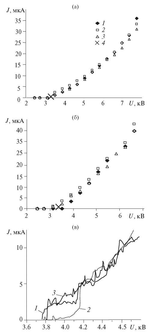 На рис. 3 представлены результаты измерения ВАХ отрицательной короны при различных материалах острийковых электродов и межэлектродных расстояниях h = 10 (рис. 3а) и 7 мм (рис. 3б). Токовые координаты каждой точки графиков определялись средним арифметическим по максимальному и минимальному показаниям прибора. Результаты измерений показали, что в момент появления КР имеют место сильные флуктуации тока и свечения. Появление неустойчивостей обусловлено возникновением АКТ, механизм которых рассмотрен во Введении. Из рис. 3 видно, что напряжение зажигания не зависит от расстояния до анода. Этот эффект согласуется с данными [9] и объясняется следующим образом. Кончик иглы близок к полусфере (рис. 1), поэтому критическая напряженность оценивается как Е* = U* / r0. Согласно ВАХ, имеем U* ~ 3 кВ и при r0 = 22 мкм получаем Е* = 1.3 МВ/см. При таких значениях Е* основным механизмом генерации электронов является холодная эмиссия c микровыступов [13]. Подобные микровыступы оплавляются, хаотически перемещаясь по поверхности кончика катода (см. разд. 1.5). Это, в свою очередь, приводит к флуктуациям тока и свечения в момент зажигания КР.