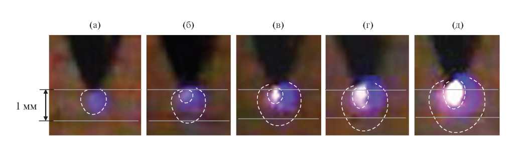 Измерения показали, что в пределах напряжений 0 ≤ U ≤ U* наблюдается так называемый темновой ток, при котором отсутствует свечение. При U = U* = 5.3 кВ вначале появляется сине-голубое свечение (рис. 4а), яркость которого усиливается по мере увеличения напряжения U. Используя [5], можно сделать вывод, что при U ∼ U* начинают образовываться отрицательные ионы кислорода O–, O–2. При этом в момент зажигания цвет короны голубой, т.е. в КР преобладают ионы O–2. С повышением U до 5.7 кВ на кончике иглы появляется яркое белое свечение, окруженное голубым (рис. 4б). Это свечение показывает, что вблизи кончика острия начинает излучаться сплошной белый спектр, т.е. в этой области происходит интенсивная ионизация молекул азота и кислорода. С дальнейшим увеличением U размеры белого и голубого свечений возрастают (рис. 4в–4д). При этом в области напряжений U = 6.4–7.6 кВ на границах белого свечения и появляются бело-голубые пятна (рис. 4в, 4г). Это указывает на неравномерность ионизационных процессов в ионизационной зоне КР. Наконец, в области сильных полей область белого свечения окружена пурпурным слоем (рис. 4г), что свидетельствует о преобладании ионов азота в области пурпурного свечения [5]. Отметим, что подобные картины развития КР наблюдаются и при электродах из Cu и Al.