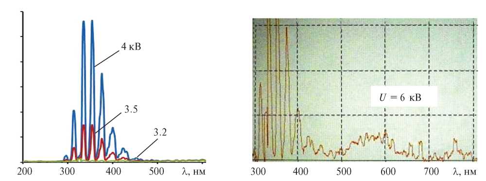 1.4. Измерение спектров КР. Одновременно с анализом появления и развития КР производилось измерение спектральных характеристик спектрометром HR2000+ (Ocean Optic). Результаты измерений в окрестности напряжения зажигания U ∼ U* и выше представлены на рис. 7а. Видно, что спектр дискретный и происходит в основном УФ-излучение за счет возбуждения молекул N2. При развитом коронном разряде (U = 6 кВ) появляются сплошной видимый и ИК-спектры с усилением ИК-излучения. Эти данные согласуются с результатами работы [46], в которой измерялся спектр излучения отрицательной иглы в воздухе при атмосферном давлении в темновой области, т.е. при U ≤ U*. Из рис. 7 следует, что интенсивность УФ-излучения преобладает и в области U > U*, т.е. при развитом КР.