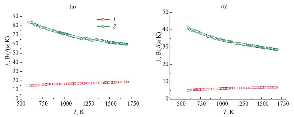Рис. 4. Температурные зависимости теплопроводности вдоль X–Y (а) и вдоль Z (б) образцов УУКМ: 1 – № 1, 2 – № 2.