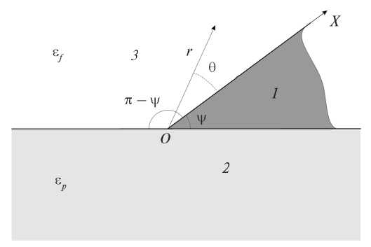 Прежде чем рассматривать задачу на рис. 1, рассмотрим малую окрестность линии смачивания трехмерной капли. В этой малой окрестности линии смачивания задачу можно считать двумерной и представить эту окрестность клином мениска проводящей жидкости с углом смачивания ψ, который расположен на поверхности полупространства, заполненного диэлектриком с проницаемостью εp. При этом свободное пространство заполнено веществом с диэлектрической проницаемостью εf. Найдем характер сингулярности электрического поля на линии смачивания, рассматривая соответствующую двумерную задачу, геометрия которой показана на рис. 2.