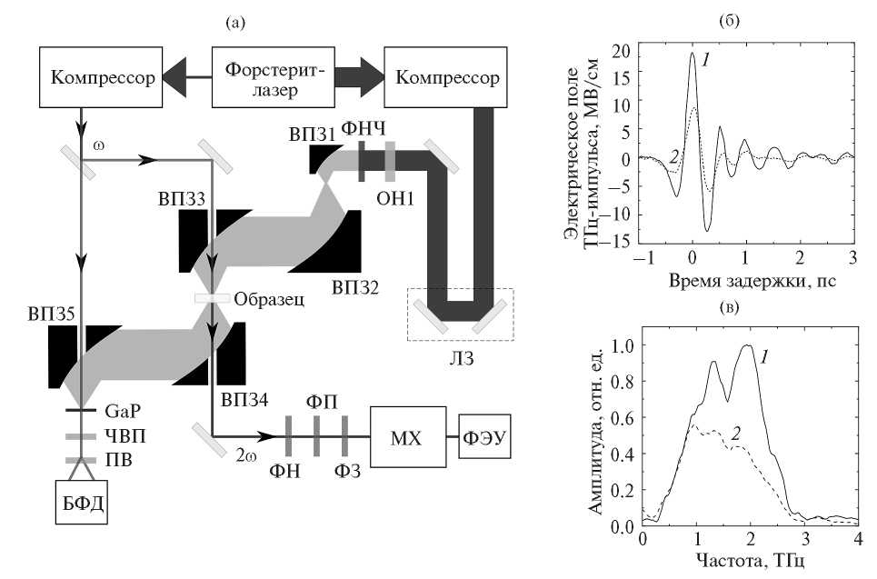Рис. 1. Схема эксперимента (а): ФНЧ – фильтр нижних частот, ВПЗ – внеосевые параболические зеркала, ТГц – возбуждающий ТГц-импульс, ЛЗ – линия задержки, ФН – нейтральный фильтр, ФП – полосовой фильтр, ФЗ – защитный фильтр, МХ – монохроматор Черни–Тернера, ФЭУ – охлаждаемый фотоэлектронный умножитель, ЧВП – четвертьволновая пластинка, ПВ – призма Волластона, БФД – балансные фотодиоды, ω и 2ω – фемтосекундный лазерный импульс на основной и удвоенной частотах; (б) 1 – волновая форма падающего ТГц-импульса, 2 – волновая форма ТГц-импульса, прошедшего через образец; (в) – соответствующие нормированные амплитудные спектры, полученные обработкой сигналов (б) преобразованием Фурье.