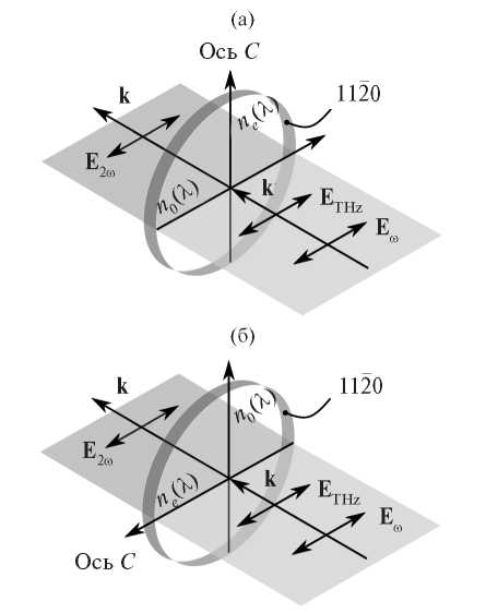 3. Fig. 2. Geometry of the orientation of the sapphire crystal axis C: (a) – the case when the electric field vector of the THz pulse ETHz is perpendicular to the optical axis C; (b) – the ETHz vector is parallel to the optical axis C.