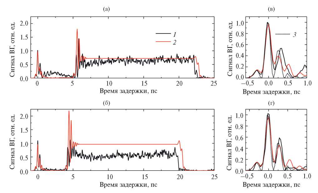 На экспериментальных графиках можно выделить несколько характерных областей времени задержки. Вблизи td = 0 пс наблюдается всплеск генерации ВГ. Затем, начиная от td = 1–5.5 пс на рис. 3а и td = 1–4 пс на рис. 3б генерация ВГ существенно подавлена (рис. 3а) или даже отсутствует (меньше уровня шума на рис. 3б). Затем снова происходит резкое возрастание сигнала ВГ с последующим сохранением квазипостоянной величины и резким падением до нуля при td = 23 пс на рис. 3а и 20 пс на рис. 3б. При временах задержки больше 20 пс для рис. 3б или 23 пс для рис. 3а генерация ВГ отсутствует. Теоретические графики на рис. 3а, 3б качественно повторяют экспериментальные графики с небольшими отклонениями.