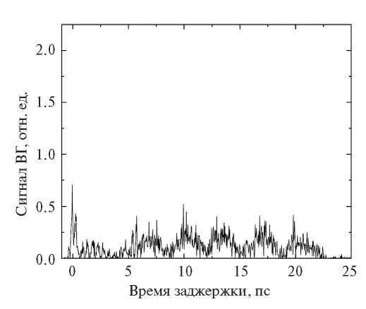 Рис. 5. Экспериментальная зависимость сигнала ВГ от времени задержки между лазерным и ТГц-импульсами для угла поворота θ = 45° оптической оси кристалла сапфира С относительно поляризации зондирующего и ТГц-полей.