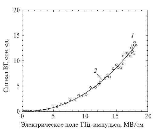 Рис. 6. Экспериментальная зависимость сигнала ВГ в окрестности второго максимума при временной задержке td = 0 пс от пиковой напряженности электрического поля ТГц-импульса (1) и ее аппроксимация стенной функцией y = ax2.18 (2), а = 0.024.