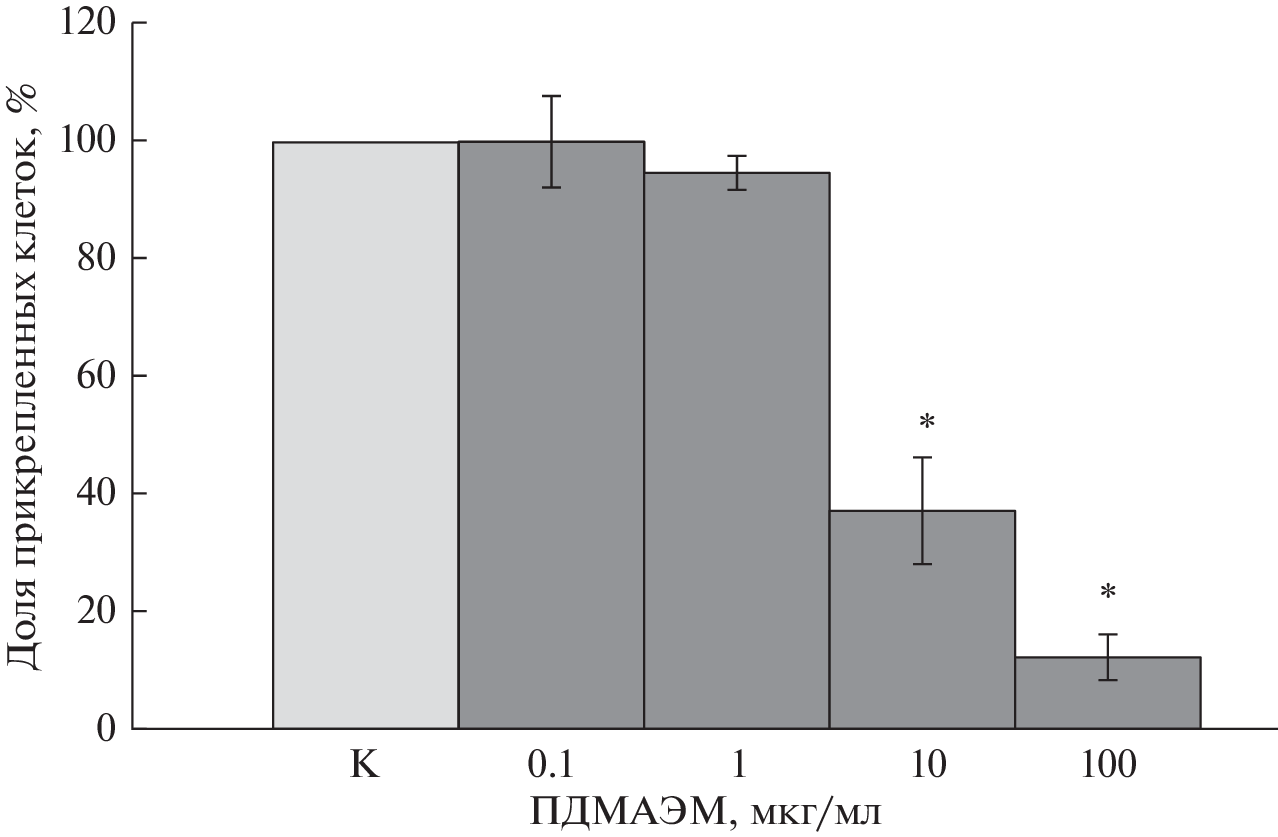 Катионные полимеры представляют собой положительно заряженные высокомолекулярные соединения, в состав которых входят N-содержащие функциональные группы, такие как первичные, вторичные и третичные аминогруппы, четвертичные аммонийные группы и др. В настоящей работе изучено действие синтетического поликатиона поли-2-диметиламиноэтилметакрилата (ПДМАЭМ) на биологическую активность фибробластов китайского хомячка и эритроцитов человека. На культуре фибробластов проведен анализ воздействия поликатиона на клеточную адгезию. В качестве субстрата использовали культуральный пластик, обработанный или необработанный поликатионом. Адсорбция поликатиона на полистироловой поверхности не приводила к изменению адгезивной способности фибробластов. Предварительная обработка фибробластов ПДМАЭМ в малых концентрациях (0.1 и 1 мкг/мл) не влияла на адгезионные свойства клеток, посеянных на необработанный пластик. При концентрациях 10 и 100 мкг/мл ПДМАЭМ ингибировал прикрепление фибробластов к этому субстрату. Установлена связь между подавлением клеточной адгезии под влиянием полимера и его токсическим действием на жизнеспособность фибробластов. Обработка эритроцитов человека поликатионом при концентрациях 10 и 100 мкг/мл приводила к повреждению клеток и выделению гемоглобина из эритроцитов. При малых дозах поликатион практически не оказывал влияния на процессы гемолиза эритроцитов. Показано, что ПДМАЭМ вызывал морфологические изменения эритроцитов и их агрегацию. Токсический эффект поликатиона в отношении эритроцитов человека в целом совпадал с таковым для фибробластов животных. Обсуждаются возможные клеточные мишени, на которые может воздействовать изученный поликатион.