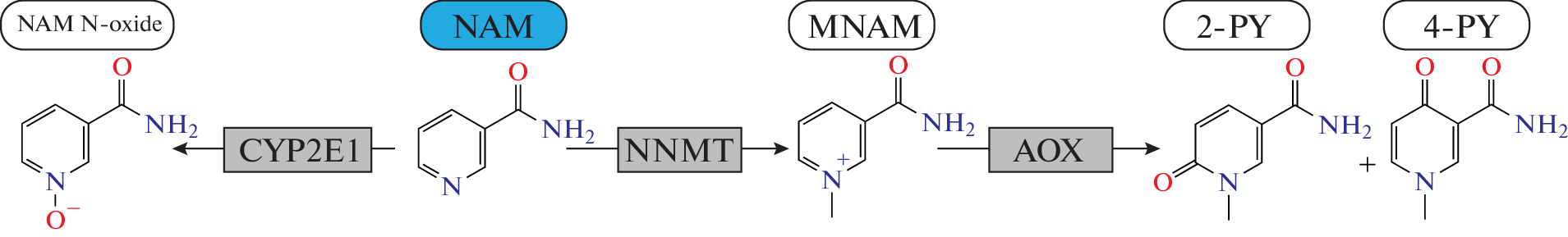 - Maeta A., Sano M., Fukuwatari T., Shibata K. 2014. Simultaneous measurement of nicotinamide and its catabolites, nicotinamide N-oxide, N(1)-methyl-2-pyridone-5-carboxamide, and N(1)-methyl-4-pyridone-3-carboxamide, in mice urine. Biosci. Biotechnol. Biochem. V. 78. P. 1306.