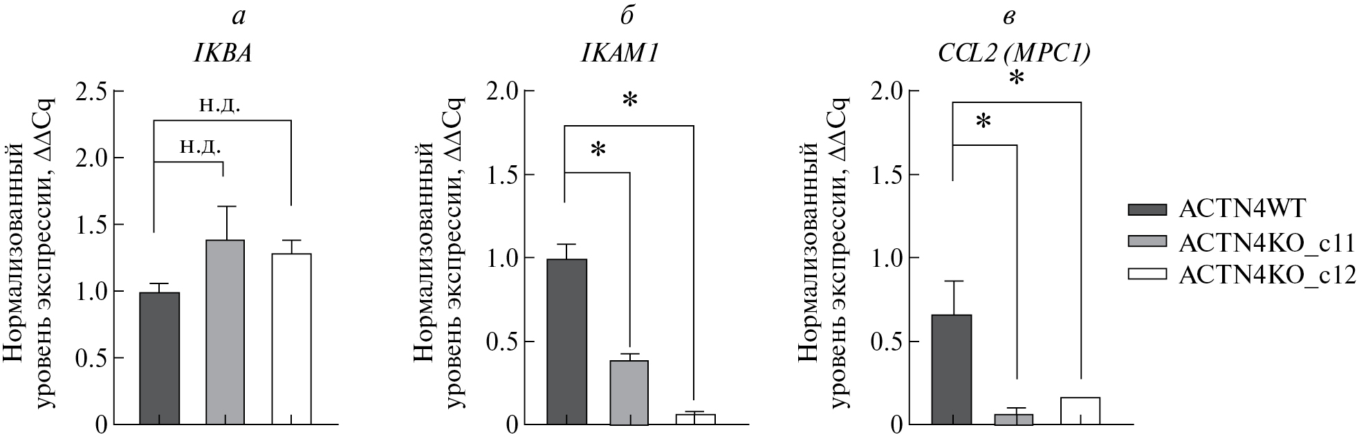 Экспрессию генов анализировали с помощью количественной ПЦР в клетках Н1299 (ACTN4WT) и в двух линиях ACTN4KO с полным нокаутом ACTN4 (ACTN4KO_cl1 и ACTN4KO_cl2). Мы установили, что подавление экспрессии ACTN4 приводит к значительному, в несколько раз, снижению экспрессии генов ICAM1 и CCL2 (MCP1), но не влияет на экспрессию гена IKBA (рис. 1). Таким образом, мы подтвердили, что ACTN4 вовлечен в селективную регуляцию генов мишеней NF-kB в нашей модельной системе.