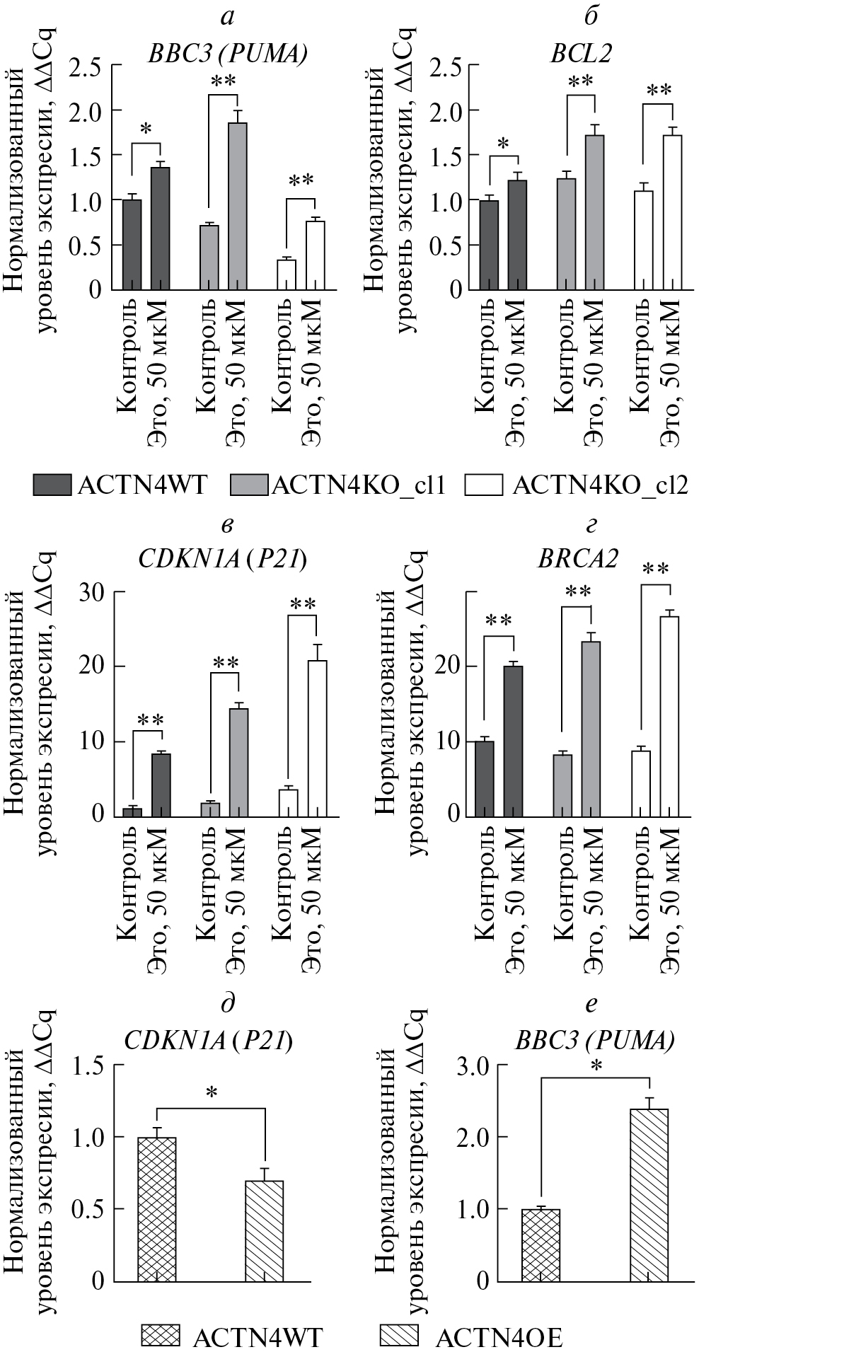 Рис. 2. Уровни экспрессии генов ответа на повреждения ДНК. ПЦР в реальном времени: а — сравнение уровней экспрессии генов в контрольных клетках H1299 (ACTN4WT) и в клетках линий H1299, нокаутных по гену ACTN4 (ACTN4KO_cl1 и ACTN4KO_cl2) до (контроль) и после обработки этопозидом (Это); б — сравнение уровней экспрессии генов в контрольной линии H1299 (ACTN4WT) и линии H1299, гиперэкспрессирующей ген ACTN4 (ACTN4OE). * — различия достоверны при p < 0.05 (U-критерий Манна–Уитни)