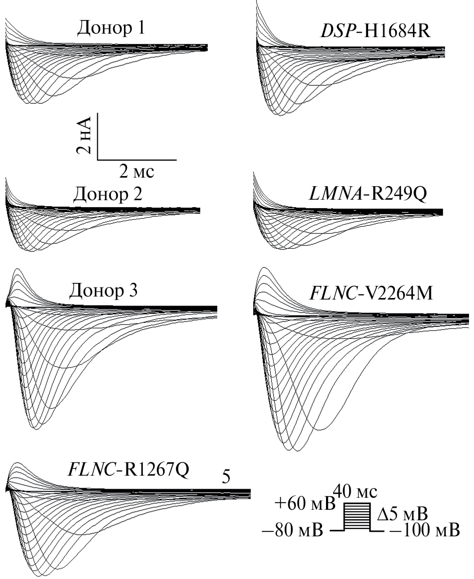 Рис. 1. Репрезентативные записи натриевых токов, зарегистрированные в клетках модели КМ-иПСК, полученных от пациентов с наследственной патологией сердца и здоровых доноров (доноры 1, 2, 3). Все представленные линии генерировали INa типичной морфологии