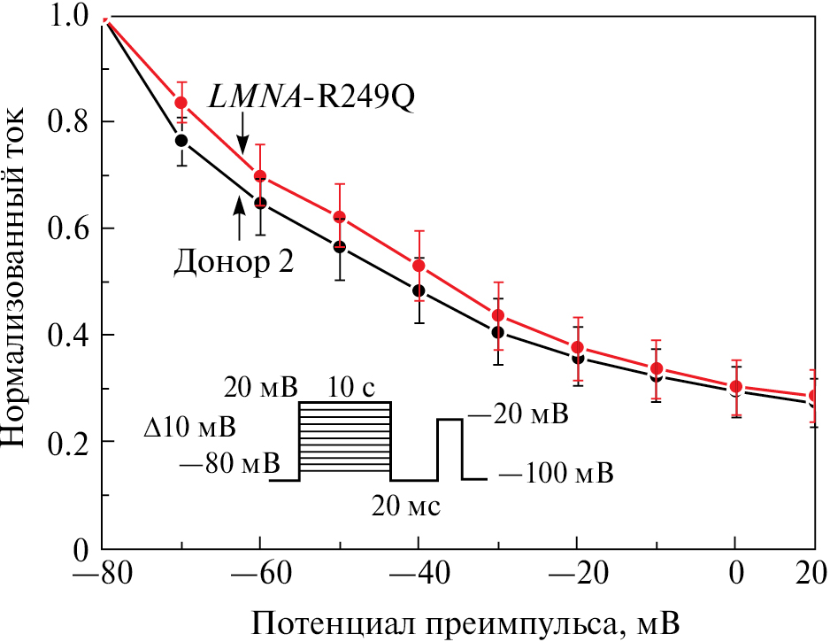 Рис. 3. Медленная инактивации Nav1.5 в КМ-иПСК, полученных от пациентов с дистрофией Эмери–Дрейфуса (мутация LMNA-R249Q, верхняя кривая, n = 9), и в клетках, полученных от здорового донора (нижняя кривая, n = 12). Не выявлено изменений кинетики стационарной медленной инактивации при потенциалах от -80 до 20 мВ (критерий Манна–Уитни)
