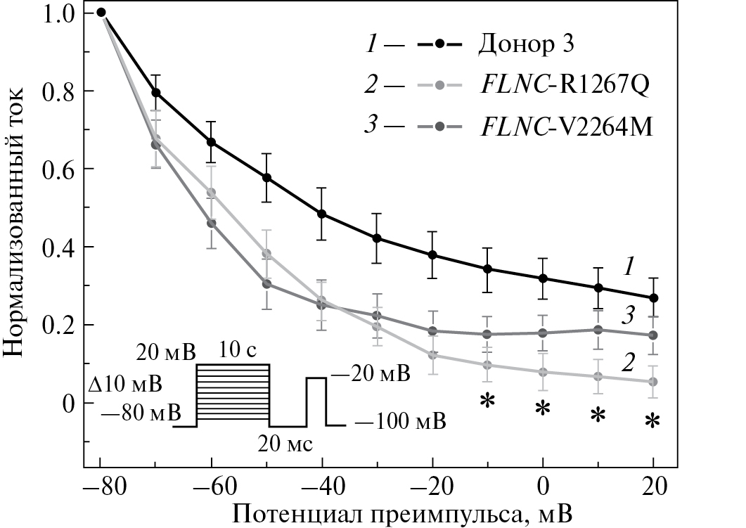 Рис. 4. Кинетика стационарной медленной инактивации Nav1.5 в кардиомиоцитах пациента с мутацией R1267Q в гене FLNC, мутацией V2264M в гене FLNC и в клетках здорового донора. Мутация R1267Q, ассоциированная со смешанным фенотипом (аритмогенной кардиомиопатией с выраженными желудочковыми аритмиями) значимо изменяла долю медленно инактивированных каналов (n = 6) по сравнению с характеристиками тока, зарегистрированными в клетках здорового донора (n = 12) при потенциалах от -10 до 20 мВ. Мутация V2264M в гене FLNC, ассоциированная со смешанным фенотипом (рестриктивной кардиомиопатией, атриовентрикулярной блокадой и желудочковой тахикардией), не изменяла долю медленно инактивированных каналов (n = 7) относительно клеток здорового донора. * — отличия значений нормированного тока относительно здоровых доноров достоверны при p < 0.05 после коррекции (критерий Манна–Уитни с последующей коррекцией на множественные сравнения с помощью метода Бенжамина–Хохберга)