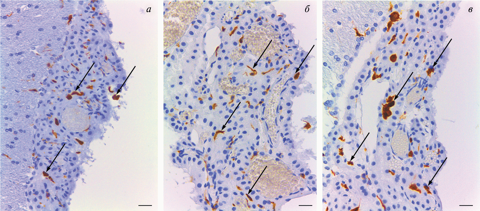 Рис. 1. Фрагменты сосудистого сплетения боковых желудочков головного мозга крыс линии Wistar (a), Wistar-Kyoto (б), SHR (в). Иммуноцитохимическая реакция на белок Iba-1 с подкраской ядер гематоксилином. Объектив Plan-Apochromat 10×/0.22. Стрелки указывают на клетки Колмера. Масштабный отрезок равен 20 мкм
