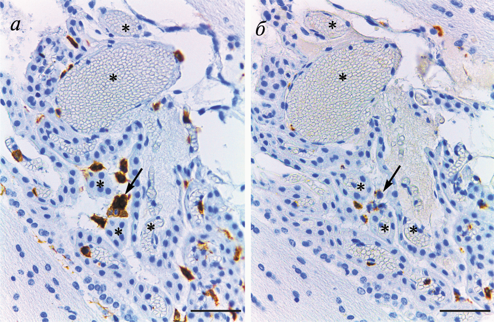 Рис. 3. Совместная локализация Iba-1 и CD68 в клетках сосудистого сплетения крысы SHR на последовательных срезах. Иммуноцитохимическая реакция на белок Iba-1 (а) и CD68 (б) с подкраской ядер гематоксилином. Стрелки указывают на клетки Колмера, звездочки — топографические маркеры, указывающие на одни и те же структуры на а, б. Объектив Plan-Apochromat 40×/0.65. Масштабный отрезок равен 50 мкм