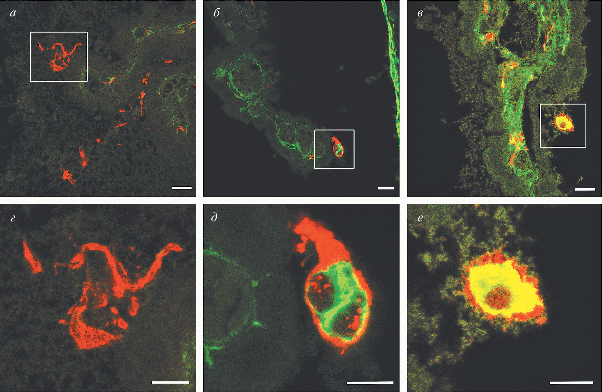 Рис. 4. Клетки Колмера в сосудистом сплетении бокового желудочка в головном мозге крысы линии Wistar (а, г), WKY (б, д) и SHR (в, е). Двойная иммунофлуоресцентная окраска на Iba-1 и виментин, визуализация при помощи флуорохромов RRX (красный цвет) и Cy2 (зеленый цвет) соответственно. Конфокальная лазерная микроскопия. Объектив Plan-Apochromat 63×/1.40 Oil DICM27 (масляная иммерсия); а–в — общий вид. Рамки ограничивают области, представленные на г–е. Масштабный отрезок — 10 мкм. г, д, е — отдельные клетки Колмера на поверхности сосудистого сплетения крыс линии Wistar (г), WKY (д) и SHR (е). Масшабный отрезок равен 5 мкм
