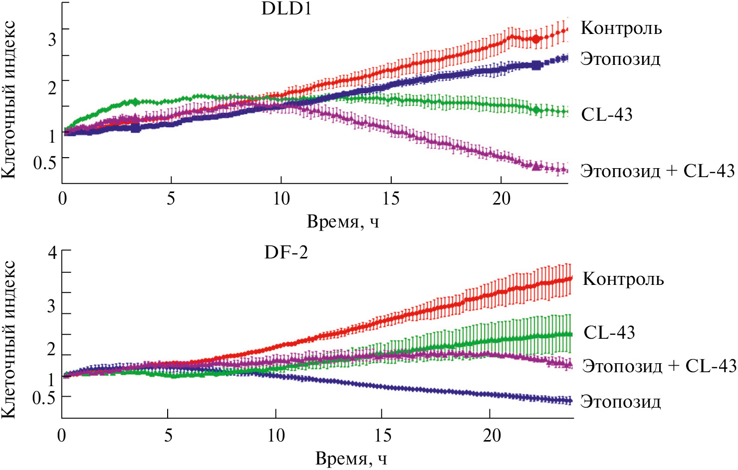 Для анализа клеточного индекса в лунки 16-луночной E-платы, на дне которой вмонтированы золотые микроэлектроды, рассевали клетки DLD1 (8 тыс./лунка) и DF-2 (2 тыс./лунка) На следующий день меняли среду и одновременно вносили противоопухолевый препарат этопозид (10 мкМ) и/или CL-43 (0.25 мкМ) и далее на протяжении 40 ч каждые 10 мин оценивали клеточный индекс. Контролем служили клетки, в среду которых добавляли только ДМСО в концентрации, соответствующей таковой в среде с внесенным CL-43. Результаты обрабатывали в программе RTCA Data Analysis Software 2.0 (Acea Bio, США).