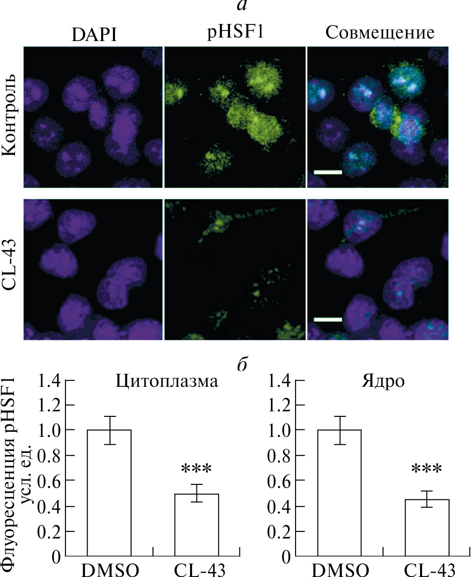 Рис. 3. Локализация активного HSF1(pHSF1) в клетках DLD1 (а) и его количественное распределение (б) после обработки CL-43 в концентрации 250 нм; а – конфокальная микроскопия; после фиксации клетки взаимодействовали с первичными антителами к pHSF1 и вторичными, конъюгированными с меткой Alexa 488. Ядра дополнительно окрашивали DAPI (синий цвет). Контролем служили клетки, в среду которых добавляли ДМСО в концентрации, соответствующей варианту с добавлением раствора CL-43; масштабная линейка: 5 мкм; б – гистограммы показывают средние значения и среднеквадратичные отклонения (из 100 клеток) интенсивности флуоресценции (усл. ед.) pHSF1 в цитоплазме и ядре; (***) – различие достоверно при p < 0.005.