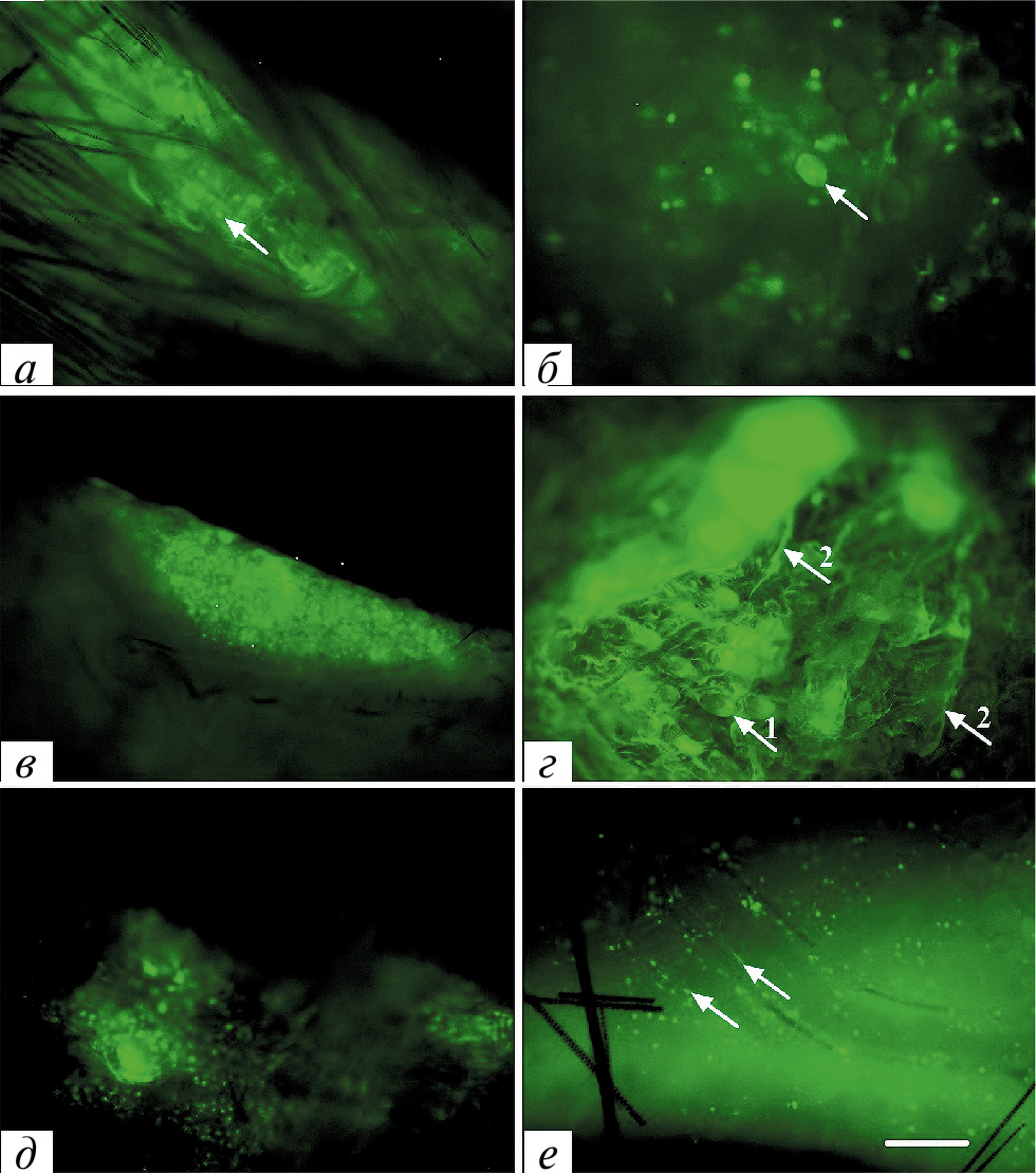 Рис. 1. Химеризация кожи с дифференцировкой донорских клеток: а – кератиноциты с ядрами (паракератоз) в роговом слое через 21 сут после сингенной трансплантации костного мозга (ТКМ); б – одиночный кератиноцит в глубине кожи с внутренней стороны (дискератоз) через 28 сут после аллогенной ТКМ (стрелка); в – внешняя сторона новой кожи с множеством флуоресцирующих клеток через 35 сут после аллогенной ТКМ; г – флуоресцирующие коллагеновые тяжи, бесклеточная масса и кератиноциты с ядрами в отслоившейся мертвой коже через 35 сут после аллогенной ТКМ изнутри. Стрелкой 1 указан кератиноцит, стрелкой 2 – коллагеновые тяжи; д – множество GFP+-фибробластов и кератиноцит через 55 сут после сингенной ТКМ снаружи; е – десятки округлых GFP+-клеток и единичные фибробласты изнутри через 35 сут после сингенной ТКМ. Стрелками указаны фибробласты. Масштабная линейка: 50 мкм. Ув. об.: 20×.