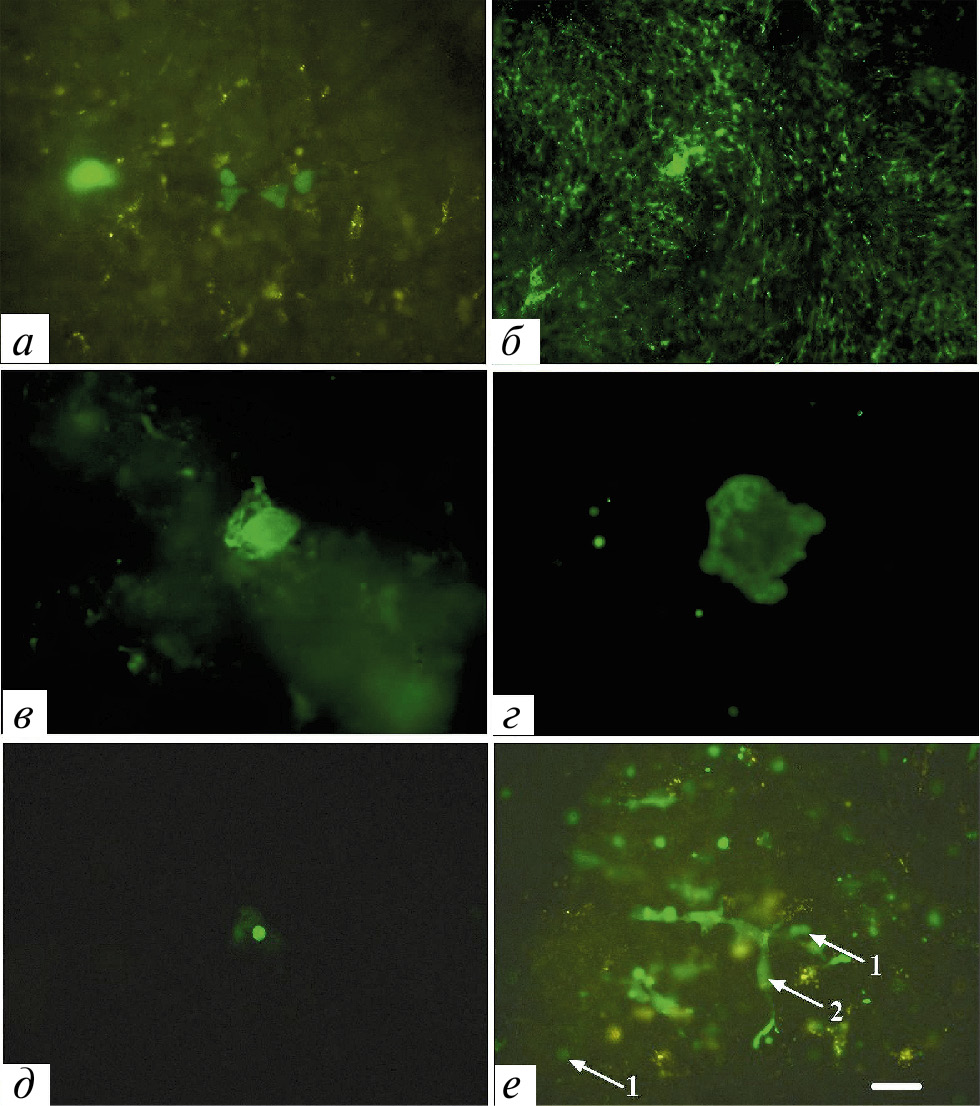 Рис. 2. Химеризация печени и селезенки с дифференцировкой донорских клеток: а – GFP+-клетки неправильной формы и треугольные в печени через 1 сут после аллогенной ТКМ; б – GFP+-структуры из клеток Ито в печени в виде вихрей, колец и лучей через 35 сут после аллогенной ТКМ; в, г – GFP+-мегакариоцит в печени и селезенке соответственно через 55 сут после аллогенной ТКМ; д – гепатоцит донорского происхождения через 35 сут после сингенной ТКМ; е – GFP+-гепатоциты (1) рядом с GFP+-клеткой Ито донорского происхождения (2) через 28 сут после аллогенной ТКМ. Масштабная линейка: 50 мкм. Ув. об.: 40× (а, в–е), 10× (б).