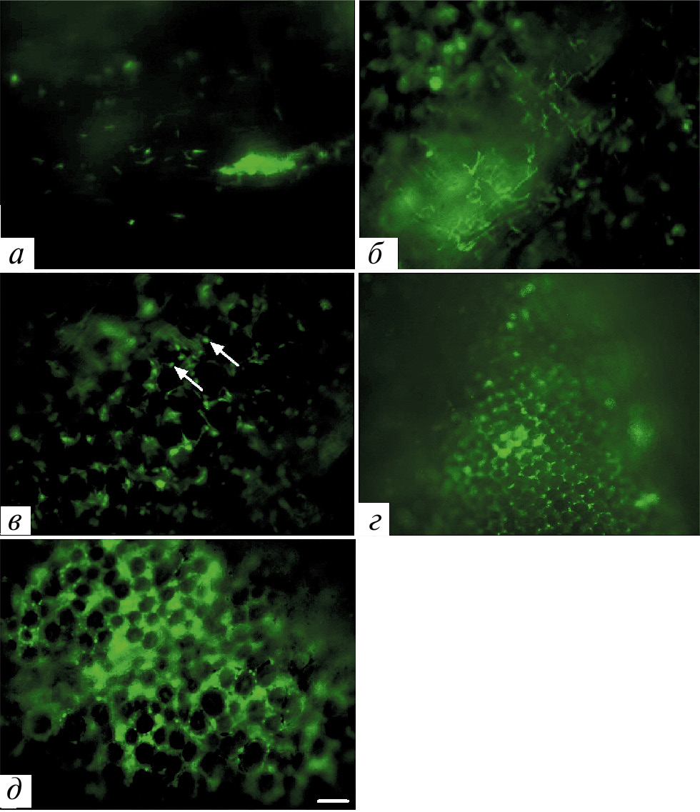 Рис. 3. Химеризация прямой кишки с дифференцировкой донорских клеток: а – GFP+-фибробласты нормального размера через 14 сут с внешней стороны кишки (в мышечном слое) после сингенной ТКМ; б – GFP+-фибробласты гигантского размера с разветвлениями с внешней стороны кишки (в мышечном слое) через 14 сут после аллогенной ТКМ; в – GFP+-клетки, похожие на бокаловидные (стрелки), через 14 сут после аллогенной ТКМ; г – основания ворсин правильной 6-гранной формы в поперечном сечении через 35 сут после сингенной ТКМ; д – деформированные, разного размера ворсины, окруженными слоями соединительнотканных GFP+-клеток через 35 сут после аллогенной ТКМ. Масштабная линейка: 50 мкм. Ув. об.: 20× (а, б, г, д), 10× (в).