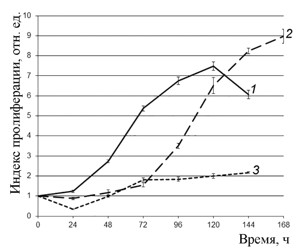 Рис. 2. Кривые роста клеток линии MSCWJ-3 на пассажах 6 (кривая 1), 16 (кривая 2) и 24 (кривая 3).