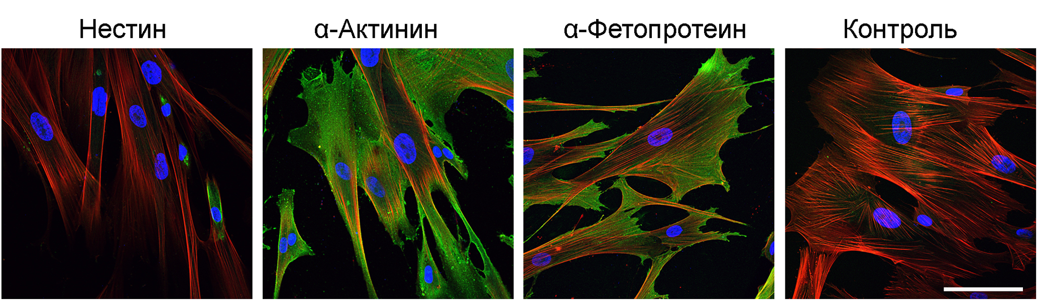 Рис. 4. Идентификация маркеров ранней дифференцировки эмбриональных стволовых клеток человека в клетках линии MSCWJ-3 на 6-м пассаже по флуоресценции соответствующих моноклональных антител. Зеленым цветом показаны маркеры эктодермы (нестин), мезодермы (α-актинин), энтодермы (α-фетопротеин). Ядра окрашены Hoechst 33342. Масштабная линейка: 100 мкм.
