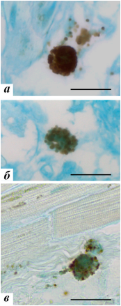 Все протоколы позволили получить примерно одинаковое окрашивание гранул тучных клеток. Было выявлено, что на одном и том же срезе тучные клетки окрашиваются неравномерно (рис. 2). Условно можно выделить три группы: 1 – интенсивно окрашенные тучные клетки (рис. 2а), 2 – тучные клетки средней интенсивности окраски (рис. 2б) и 3 – слабоокрашенные тучные клетки. Тучные клетки первой группы характеризуются тем, что все их гранулы дают интенсивную положительную иммуногистохимическую реакцию. Для некоторых гранул характерна более интенсивная окраска по периферии (рис. 2а, в), для других – равномерная окраска. Часть клеток окрашивается настолько интенсивно, что дать оценку окрашенности отдельных гранул не представляется возможным. Большая часть гранул тучных клеток второй группы окрашена, при этом между гранулами наблюдаются участки цитоплазмы, окрашенные только альциановым синим. Для тучных клеток третьей группы характерно окрашивание гранул по периферии клетки и единичных гранул в центре клетки. Вне зависимости от группы тучные клетки содержали гранулы разного размера (рис. 2б).