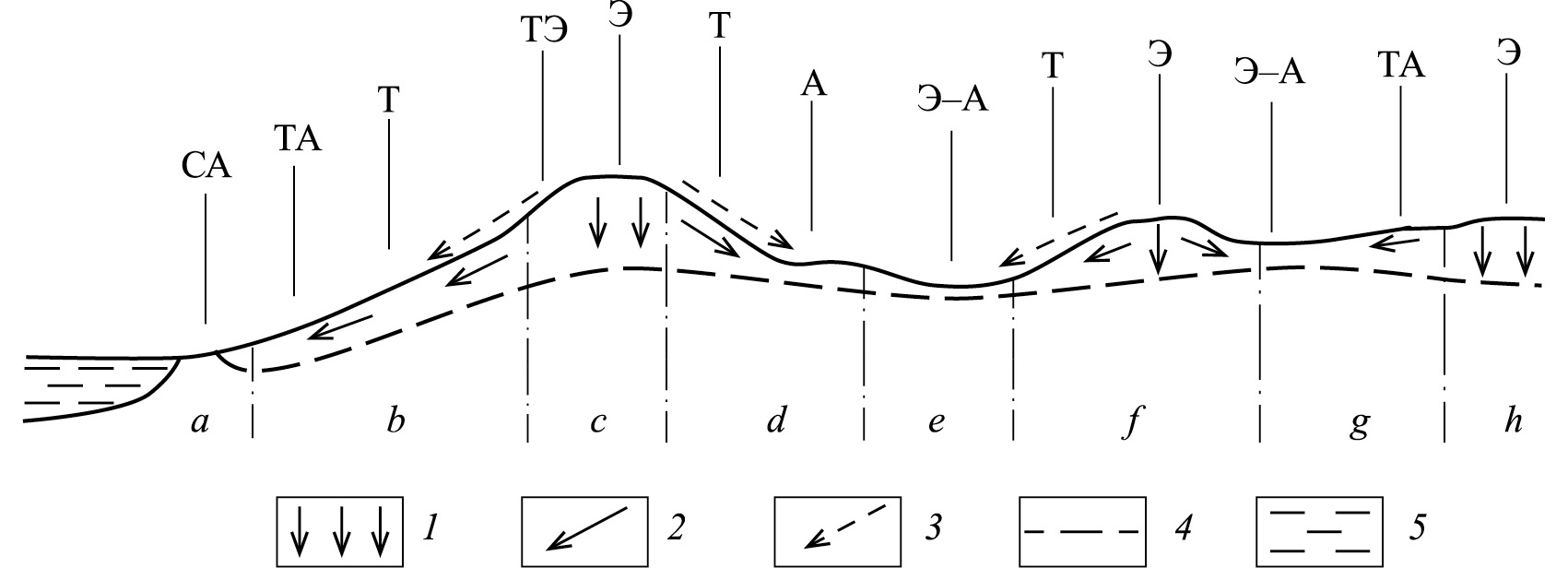 Рис. 1. Схема катенарной организации ландшафтных фаций (биогеоценозов) и их групп в условиях равнинного и низкогорного рельефа. Перенос влаги и вещества в почве и рыхлых отложениях: 1 — в вертикальном направлении; 2 — вдоль склона; 3 — литодинамические и воздушные потоки; 4 — уровень грунтовых вод; 5 — водоем. Локальные типы местоположений (по: Высоцкий, 1960; Глазовская, 1964): Э — элювиальный (плакорный); ТЭ — трансэлювиальный; Т — транзитный; ТА — трансаккумулятивный; А — аккумулятивный; СА — супераквальный (здесь и на рис. 2).