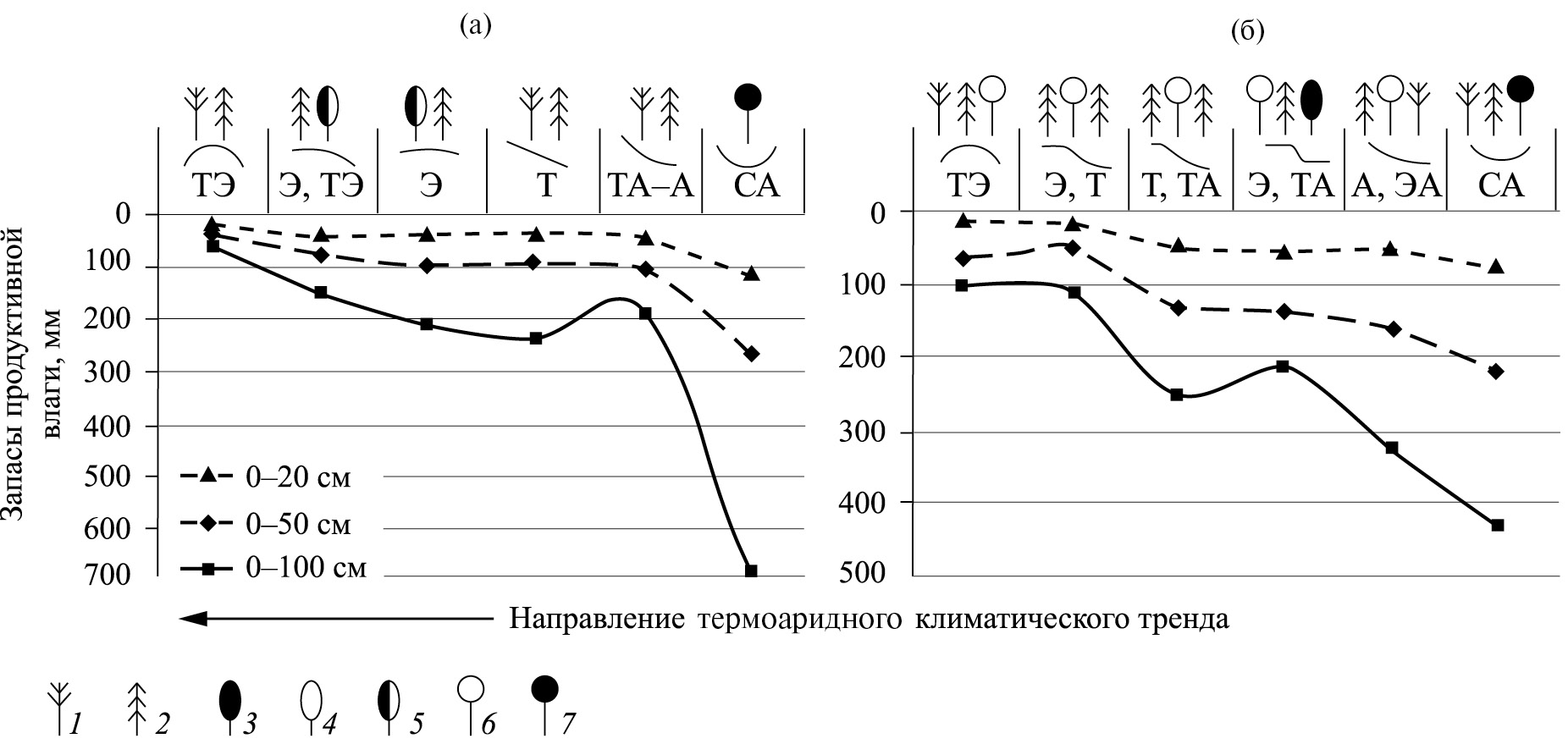 Рис. 2. Распределение таксономических норм среднеиюльских запасов продуктивной влаги в слоях почвы 0–20, 0–50 и 0–100 см почве различных групп лесных биогеоценозов в системе их катенарной организации, адекватной термо-аридному климатическому тренду. Экорегионы Среднего Поволжья: (а) — северная граница широколиственнолесной подзоны на Приволжской возвышенности (полигон “Зеленый Город”); (б) — южная полоса подтаежной зоны в Низменном Заволжье (полигон “Керженец”). Лесообразующие древостои-доминанты: 1 — сосна; 2 — ель; 3 — дуб; 4 — липа, вяз; 5 — широколиственные без разделения; 6 — береза, осина; 7 — ольха черная.