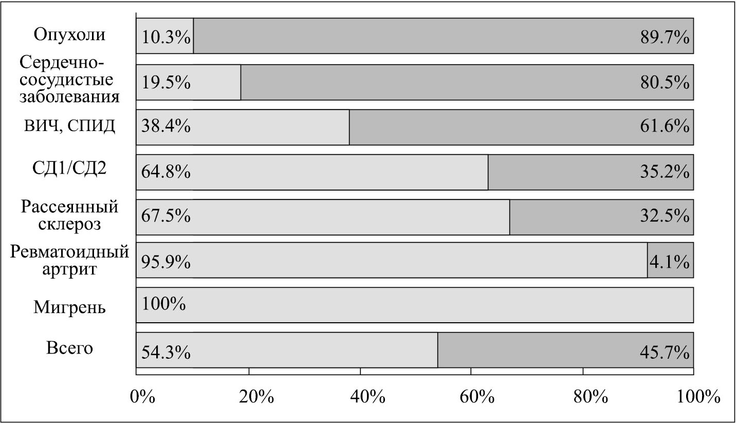 Рис. 2. Общая структура последствий заболеваний (данные по Европе). Доля инвалидизации (светло-серый) и доля смертности (темно-серый).