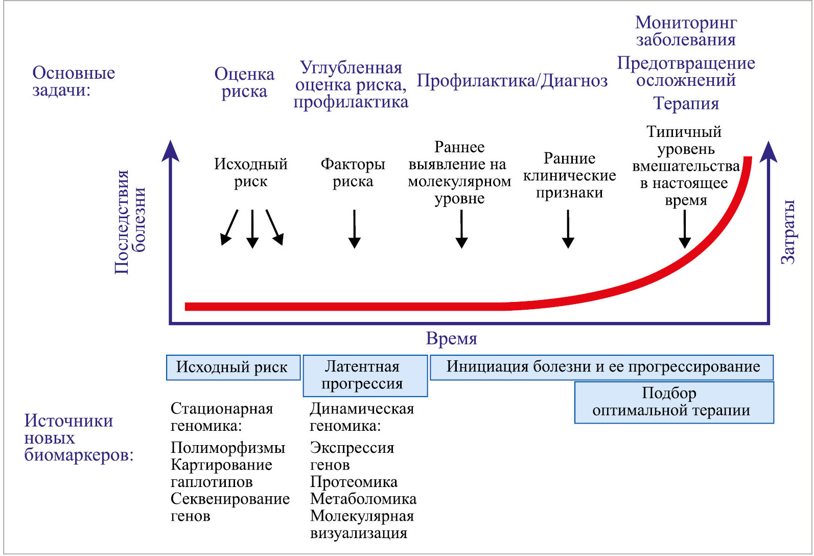 Для достижения вышеуказанной цели претворения на практике концепции ППМ должна быть создана принципиально новая стратегия, основанная как на клиническом (на фоне развернутой клинической картины заболевания), так и на доклиническом (и/или предиктивном) выявлении биоиндикаторов (биомаркеров) скрытой патологии задолго до проявления признаков болезни (рис. 8, 9).
