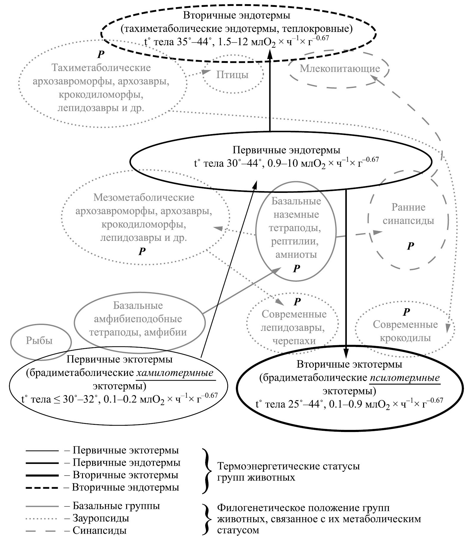 Рис. 1. Упрощенная схема эволюции термоэнергетических статусов у позвоночных животных, их основных показателей, конкретных групп животных, пошедших по разным путям этого эволюционного развития. Буквами “Р” на схеме обозначены группы позвоночных животных, которые, в соответствии с позицией Л.П. Татаринова, предполагающей горизонтальный тип систематики позвоночных (Татаринов, 2009), могут считаться рептилиями. Частичное наложение серых эллипсов, обозначающих филогенетические группы позвоночных животных, на черные эллипсы, обозначающие термоэнергетическое состояние, говорит о том, что эти филогенетические группы имеют данный термоэнергетический статус.