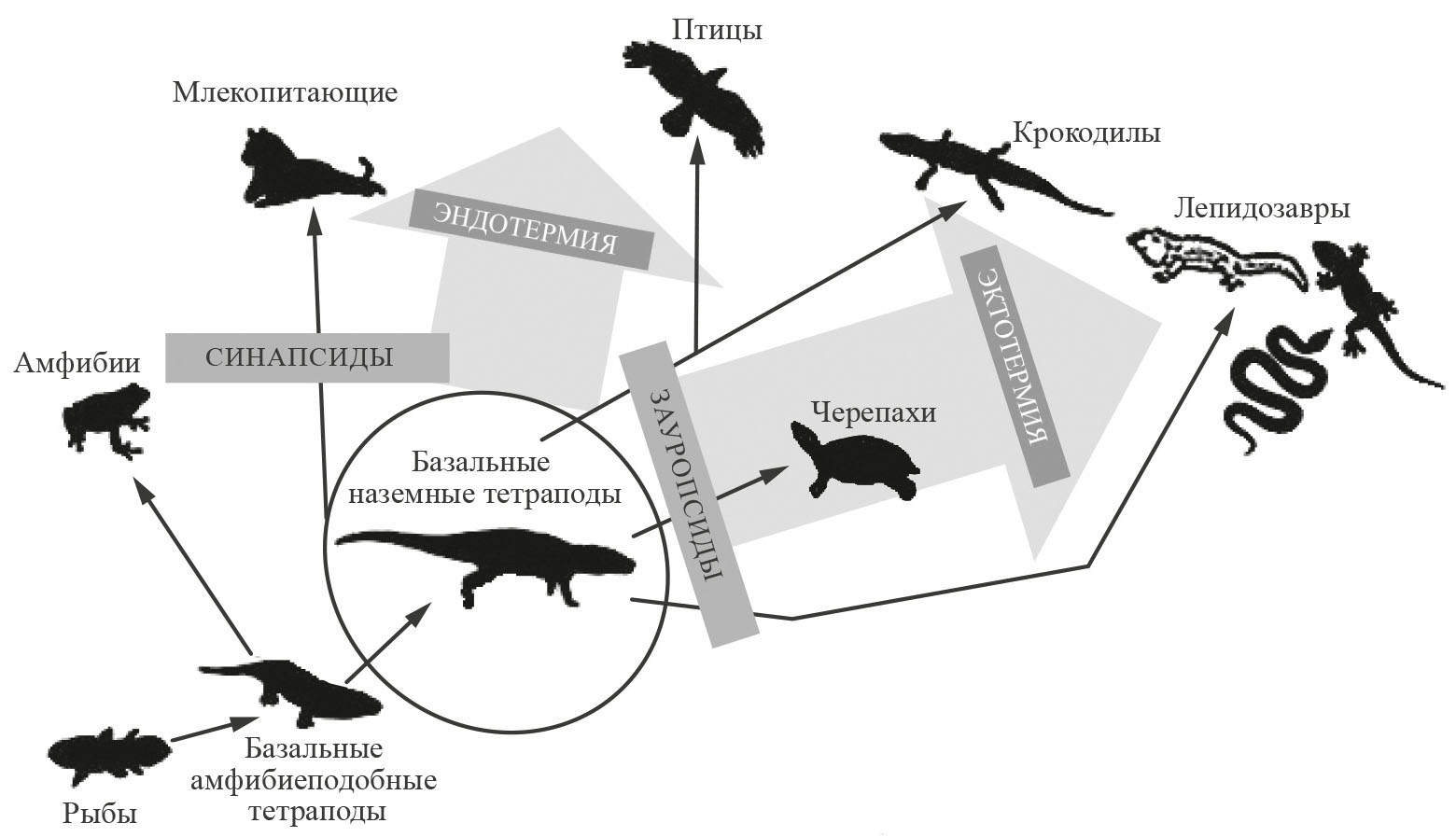 Наши исследования и анализ опубликованных материалов показали, что эволюционный процесс у позвоночных животных в значительной степени запускается, протекает и направляется в результате проявления комплекса ключевых биохимических и физиологических ароморфозов (Черлин, 1988, 2017, 2021а, 2021б), связанных с развитием их отношений с фактором температуры (Черлин, 2014, 2021а–г, 2022а, 2022б, 2023, 2024а). Эти ароморфозы выражаются в том, что в процессе эволюции изначально брадиметаболических, эктотермных рыб у сформировавшихся на их базе первых амфибиеподобных тетрапод – первичных эктотермов (Черлин, 2024а) – на определенном этапе их развития примерно 350–330 млн лет назад резко усилилась интенсивность окисления в митохондриях, вырос основной обмен, а затем и термометаболизм и повысилась температура тела. Видимо, именно благодаря таким новым качествам у этих животных существенно выросла энергообеспеченность активности, они получили возможность выйти на сушу и начать ее осваивать. Другими словами, у самых первых базальных наземных тетрапод с самого их эволюционного появления, начиная уже, как минимум, со стегоцефалов возрастом 331–326 млн лет (Whitney et al., 2022) и сеймуриоморфов возрастом 290– 270 млн лет (Estefa et al., 2020), были повышенные уровни основного обмена, то есть брадиметаболическая эктотермия их предков сменилась у них мезометаболической эндотермией. Так первичные эктотермы превратились в первичных эндотермов, одной из важных характеристик которых была, помимо прочего, еще недостаточная развитость систем оперативной нейрогуморальной регуляции уровней метаболизма и термометаболизма (Черлин, 2024а). А вскоре у них произошло повышение температуры тела, появилась мезотермия и даже определенная степень теплокровности (Harrell et al., 2016; Legendre et al., 2016; Benton, 2020; Grigg et al., 2022). И эти базальные наземные тетраподы постепенно эволюционировали в первых амниот, рептилий (Черлин, 2021а–г, 2022а, 2022б).