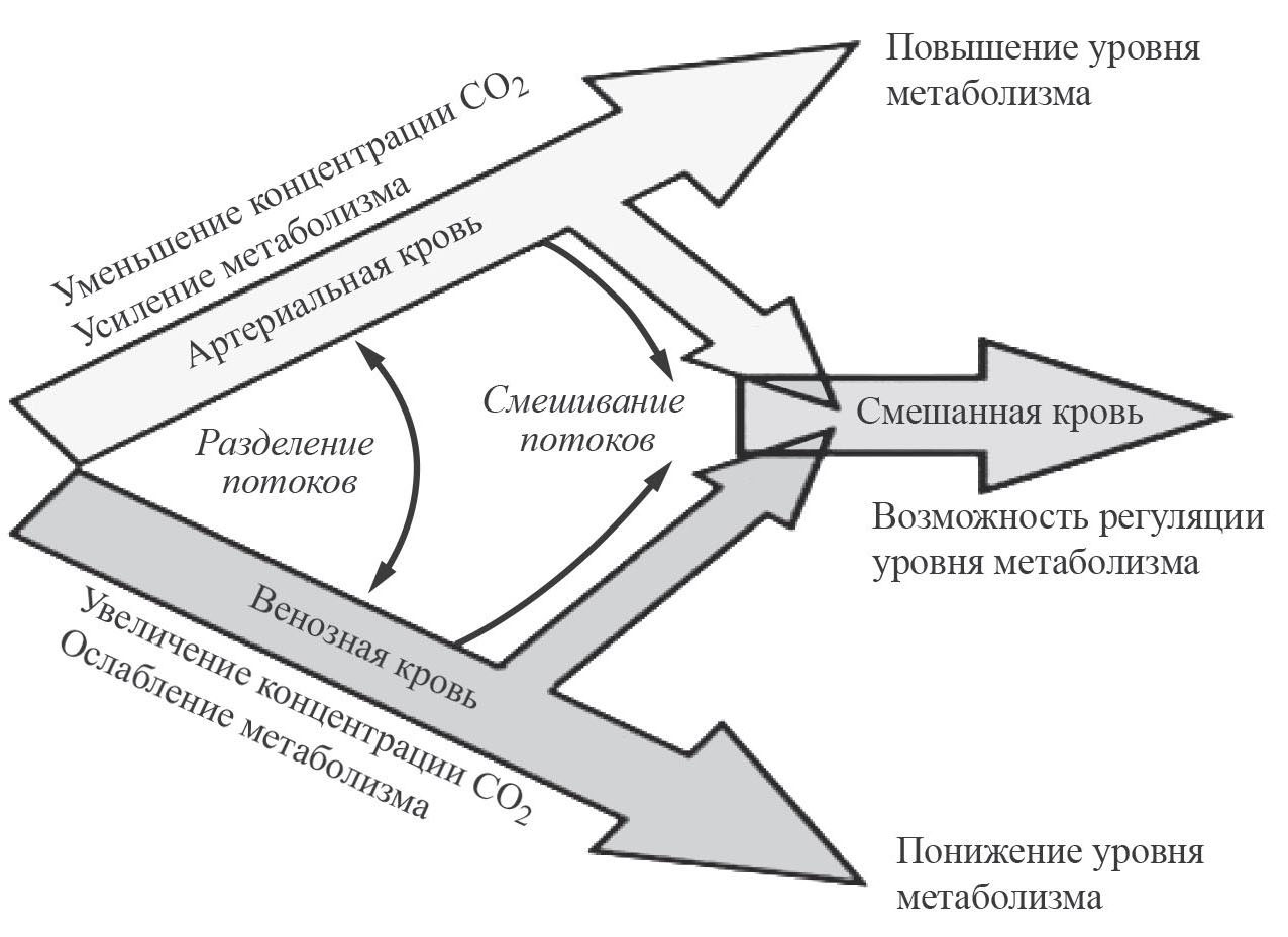 Рис. 3. Два направления проявления функций сердца у рептилий по отношению к артериальному и венозному потокам крови: снижение концентрации СО2 в крови увеличивает уровень метаболизма, повышение уровня СО2 – замедляет метаболизм.